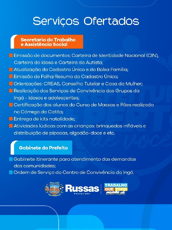 Durante a ação, serão ofertados diversos serviços, como emissão de documentos, atendimento médico, entrega de kits natalidade, orientações ao Microempreendedor Individual (MEI), além de informações sobre coleta seletiva e ações voltadas à agricultura e infraestrutura. A programação também inclui a realização da Feira da Mulher Empreendedora, valorizando o protagonismo feminino na economia local, além de atividades culturais e de lazer, com música e brinquedos infláveis para as crianças.